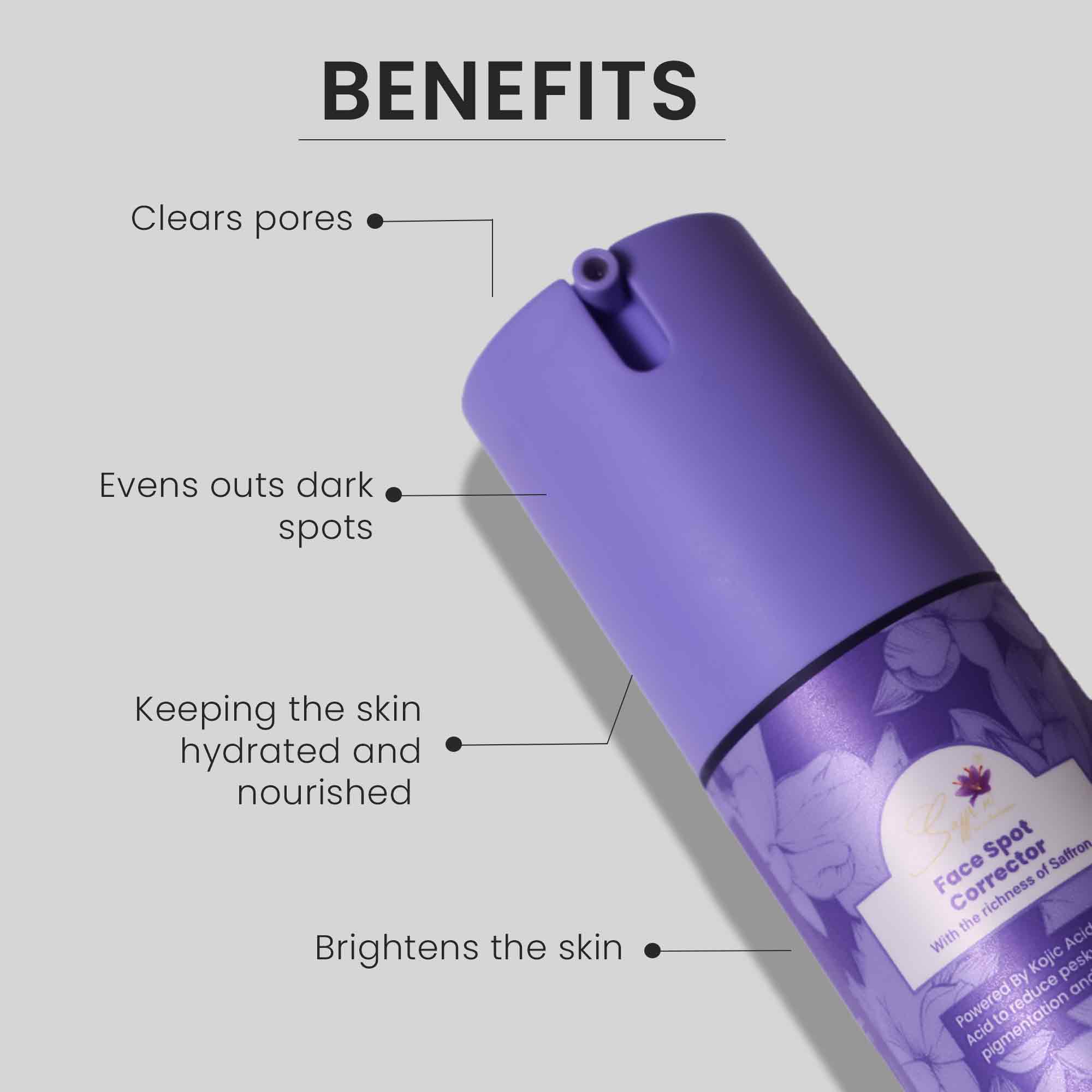 Saffr’n Face Spot Corrector is a highly effective treatment designed to target and reduce the appearance of dark spots, hyperpigmentation, and uneven skin tone. This potent formula combines powerful skin-brightening agents with nourishing and hydrating ingredients to promote a clearer, more radiant complexion. Ideal for all skin types, this non-greasy and lightweight spot corrector helps to achieve a more even and flawless skin tone.